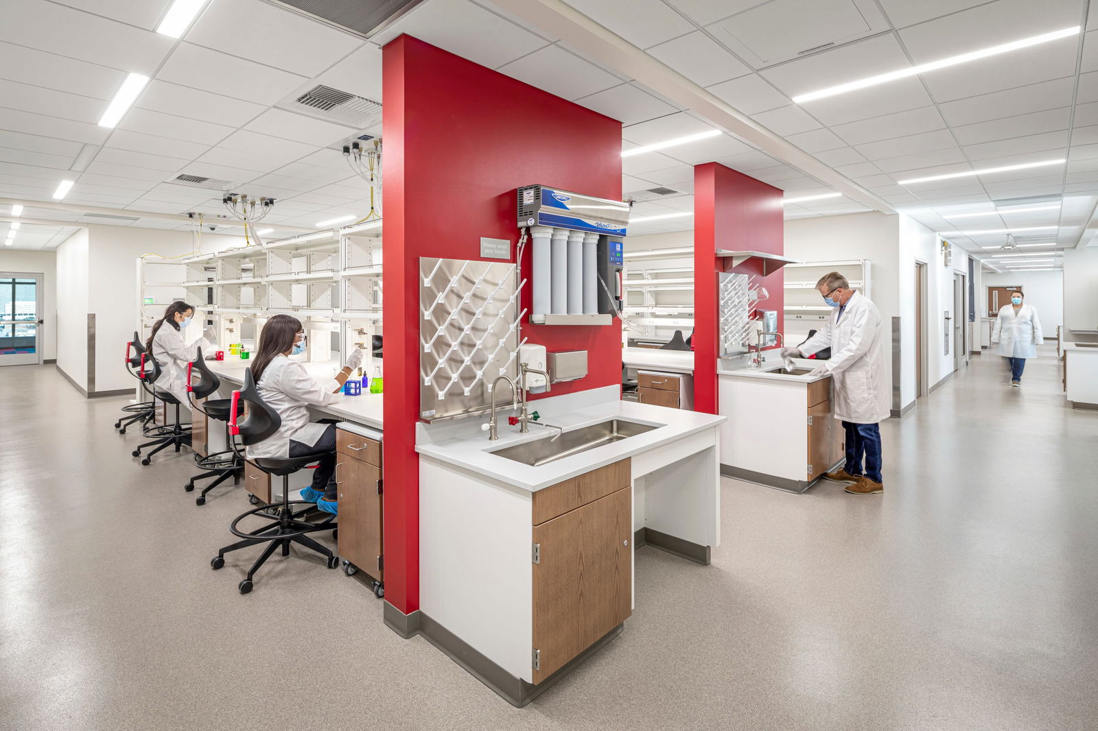 Children’s Mercy Research Institute offers the largest and most comprehensive pediatric clinical pharmacology program in North America. Floors three, four, and seven are comprised solely of wet lab space and additional specialty spaces, e.g., cGMP, BSL 3, mass spec rooms. Clinical pharmacology and genomics are two specialties that are strategically co-located on the third floor to maximize collaboration and to develop right-size treatments for specific genome mutations in children. Wet benching and a mass spectrometer space that analyzes complex samples with sensitivity, selectivity, and speed are found here. In the genomics spaces, researchers are isolating DNA, examining tissue culture, and sequencing DNA to uncover mutations, diagnose diseases, and working in tandem with clinical pharmacologists to create treatments that are personalized to the patient.