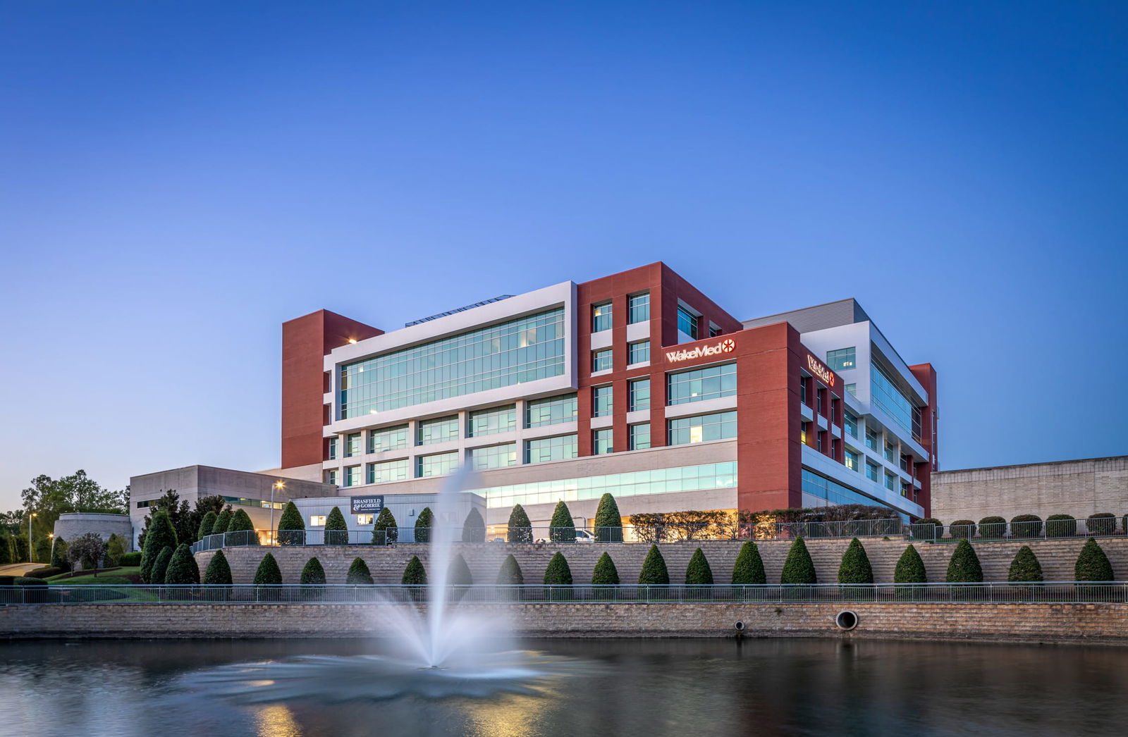 View of the WakeMed Cary Hospital, a modern medical facility building with red brick and light metal exterior with large glass windows from the highway. The building has a 'WakeMed' logo on the brick and is against a clear blue sky at dawn or dusk.