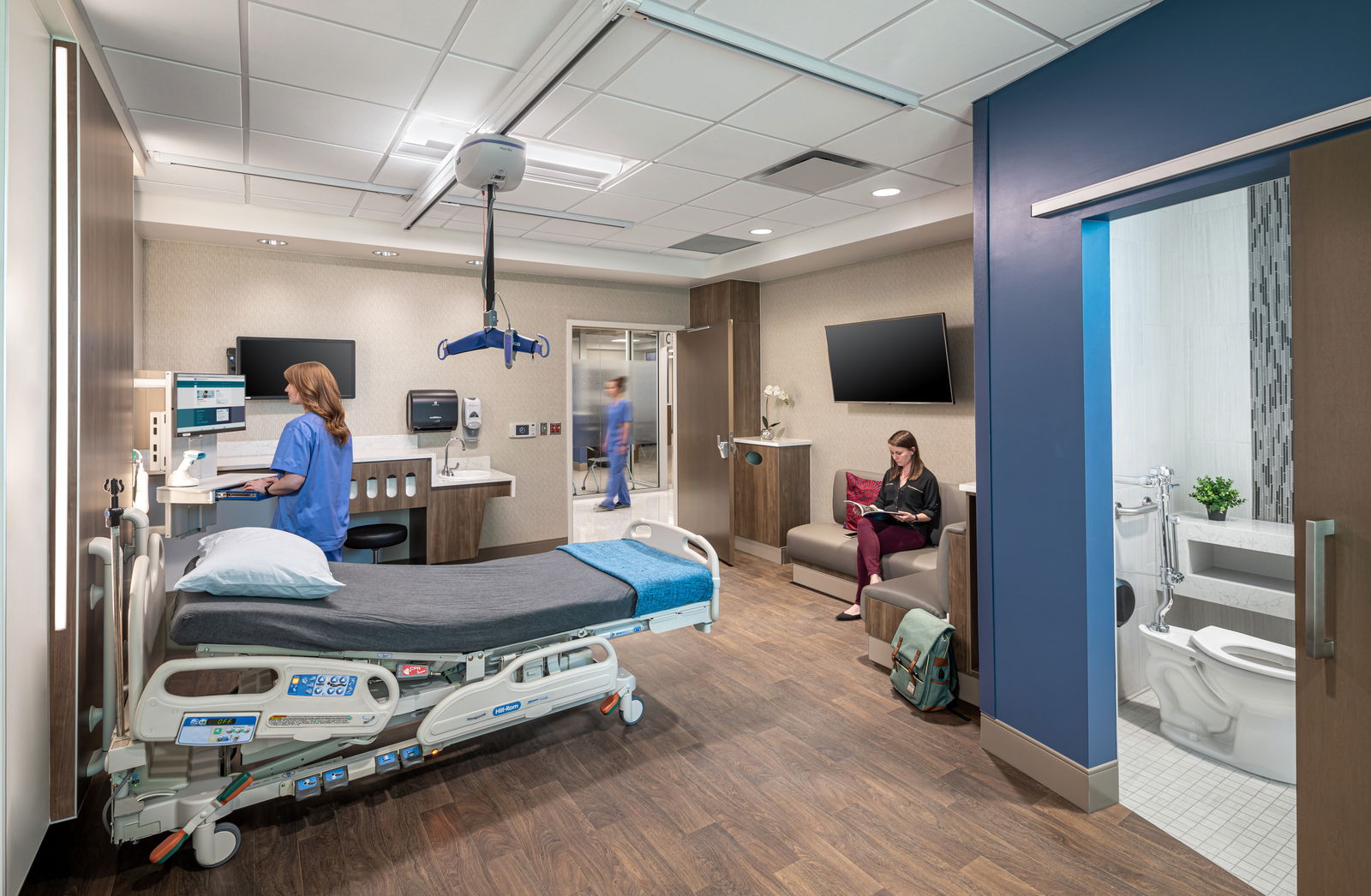 The healthcare interior design services provided by BSA focused on creating a hospitality-inspired environment that balances warmth with high-performance safety measures. Wood accents, terrazzo-look flooring, saturated color schemes, and textured wall protection elevate the user experience while maintaining sustainable hospital design principles.