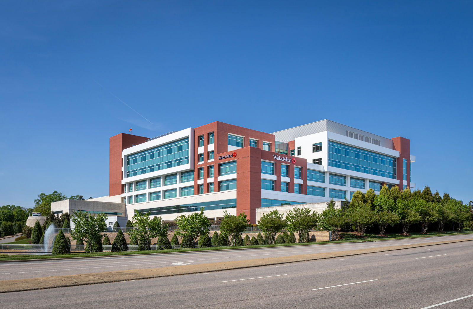 Close up view looking up at the WakeMed Cary Hospital, a modern multi-story medical facility building with red brick and white exterior with large glass windows. The closeness of this image allows one to appreciate the architectural design elements.