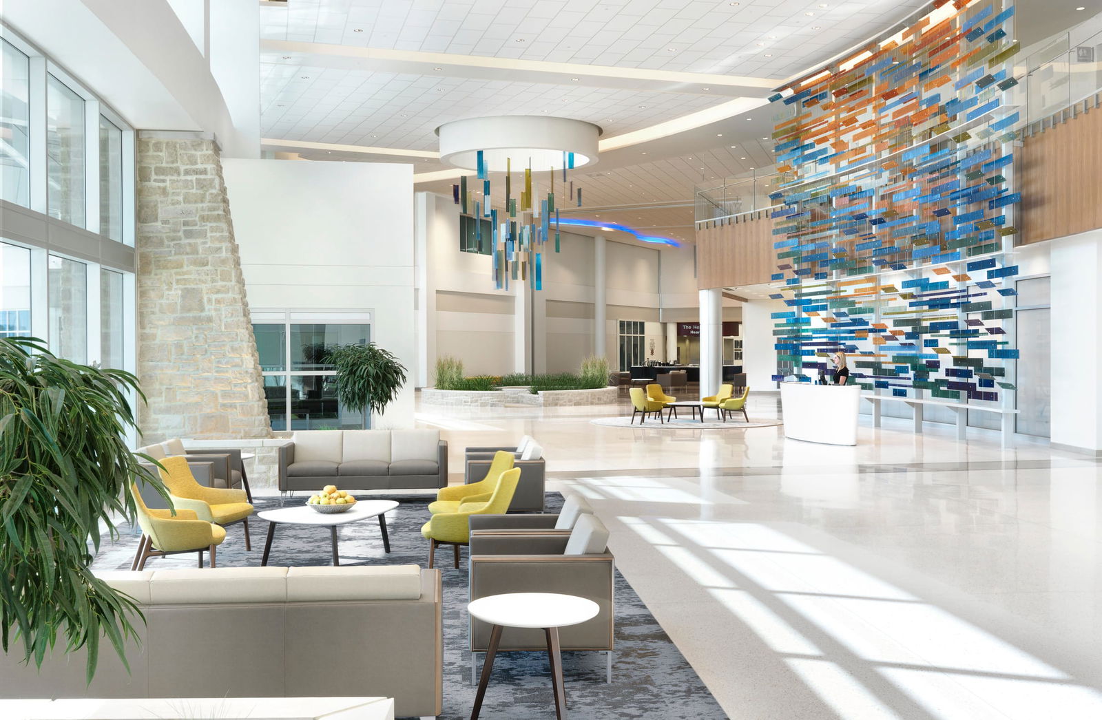 Natural light floods the space through a two-story glass curtainwall and a skylight rotunda. Our team created an inviting atmosphere with modern interiors, a café, retail spaces, and comfortable waiting areas. A custom 20’ x 30’ art feature inspired by the Ohio River sets the tone for a nature-centric healing environment. Additionally, a second hanging art installation is suspended over an interior stone garden, symbolizing movement and transformation.