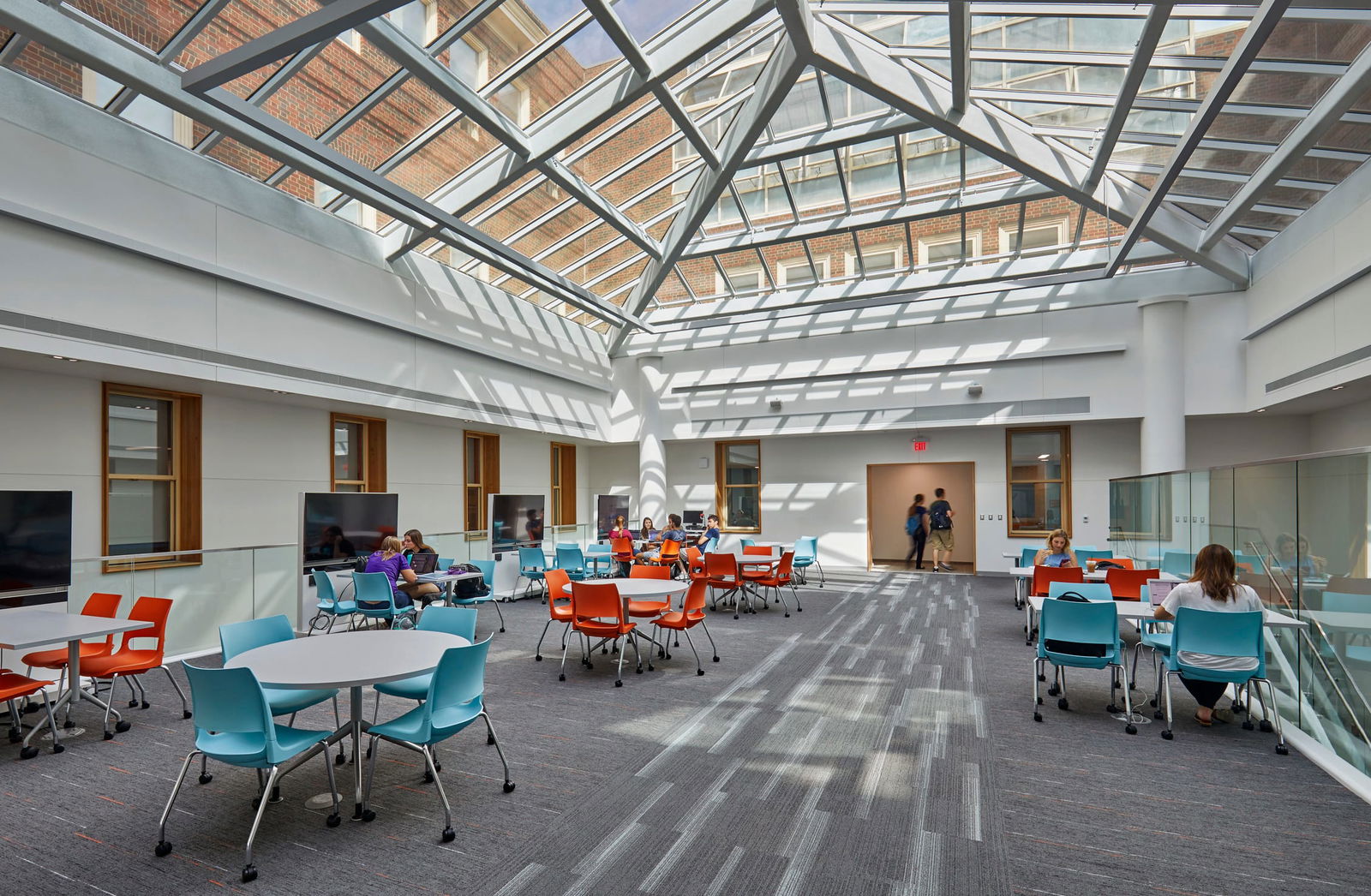 The transformation of Pearson Hall’s central atrium stands as a metaphor for the building’s reinvention. The previously enclosed courtyard became a light-filled gathering place, topped with a dramatic glass pyramid that connects students and faculty to natural light and to one another. The space literally brings people together through a connection to daylight.