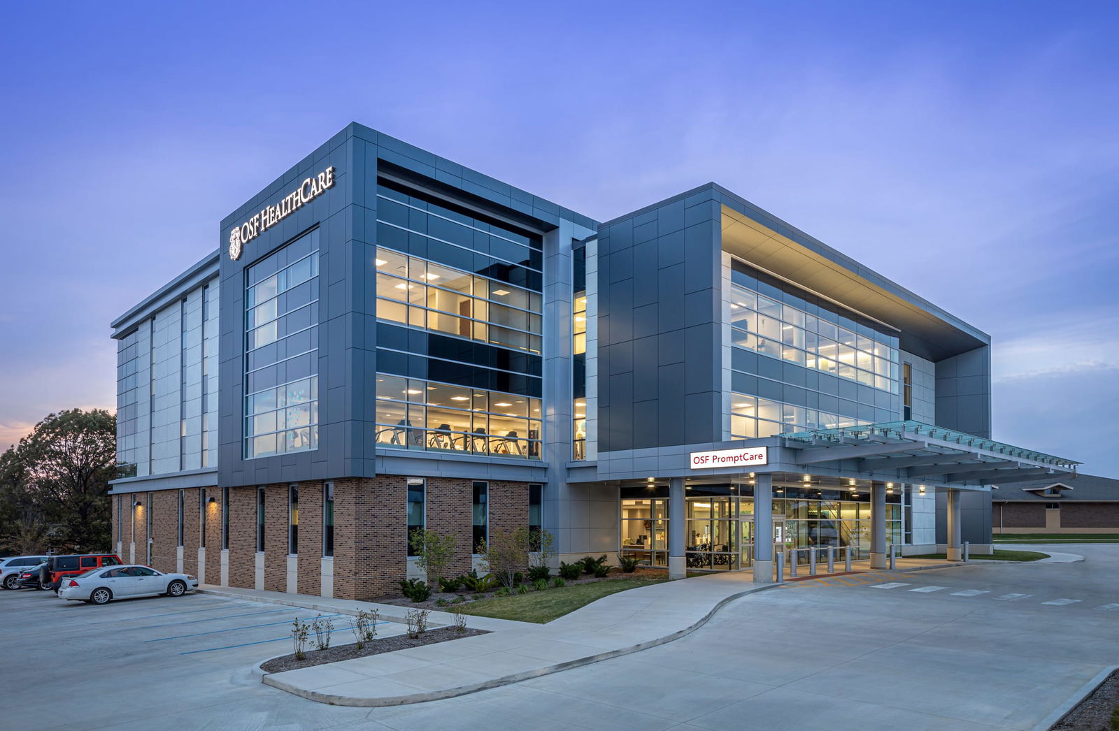 This three-story healthcare facility houses primary care providers, OSF PromptCare, an infusion clinic, occupational health services, and the OSF HealthCare Cardiovascular Institute. The integrated design ensures seamless, team-based patient care, improving efficiency and convenience for both patients and staff.
