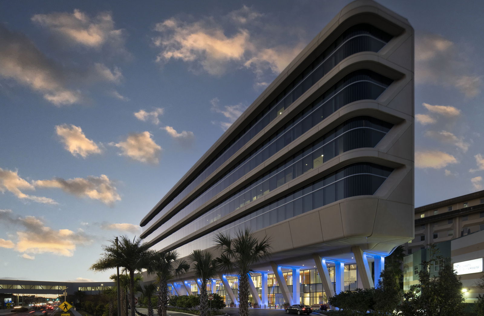 The new patient tower includes two lobbies with a drive-up front entrance, waiting rooms, on-call rooms, and conference/classroom spaces. There are three patient care floors, each with 30 patient rooms per floor. The second and third floors house the mechanical support rooms. A new pedestrian bridge across Dr. Martin Luther King Jr. Boulevard links the tower to St. Joseph’s Women’s Hospital and connects into the existing main tower at multiple levels.
